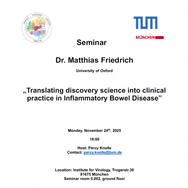 You are invited to join the seminar of Dr. Matthias Friedrich (University of Oxford) on Monday, November 24th, 2025 at 16:00.He will talk about „Translating discovery science into clinical practice in Inflammatory Bowel Disease” in the Seminar room of Virology, Trogerstr.30 at TUM Munich.
