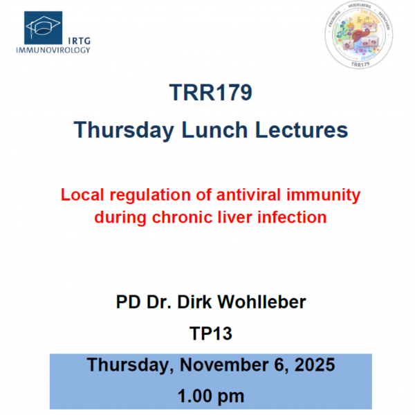 The Thursday Lunch lecture on November 6th will be given by Dirk Wohlleber (TP13, TUM) about "Local regulation of antiviral immunity during chronic liver infection"